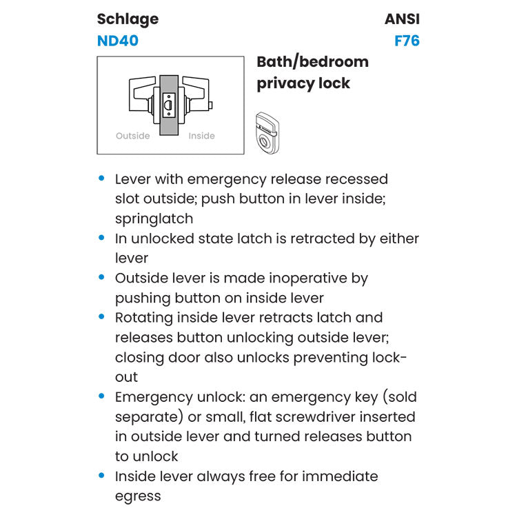 ANSI Function F76 - Lever with emergency release recessed slot outside; push button in lever inside; springlatch. In unlocked state latch is retracted by either lever. Outside lever is made inoperative by pushing button on inside lever. Rotating inside lever retracts latch and releases button unlocking outside lever; closing door also unlocks preventing lockout. Emergency unlock: an emergency key (sold separate) or small, flat screwdriver inserted in outside lever and turned releases button to unlock. Inside lever always free for immediate egress