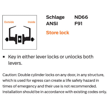 Caution: Double cylinder locks on any door, in any structure, which is used for egress can create a life safety hazard in times of emergency and their use is not recommended. Installation should be in accordance with existing codes only.