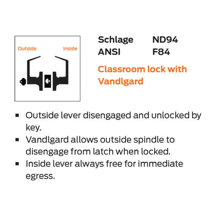 ANSI Function F84 – Outside lever disengaged and unlocked by key. Vandlgard allows outside spindle to disengage from latch when locked. Inside lever always free for immediate egress.