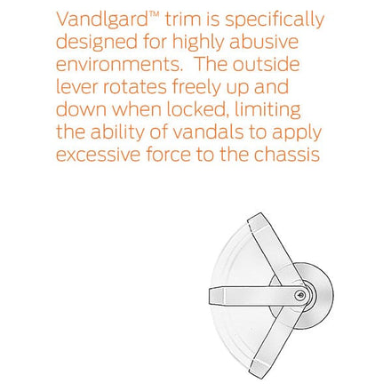 Vandlgard™ trim is specifically designed for highly abusive environments. The outside lever rotates freely up and down when locked, limiting the ability of vandals to apply excessive force to the chassis.