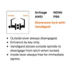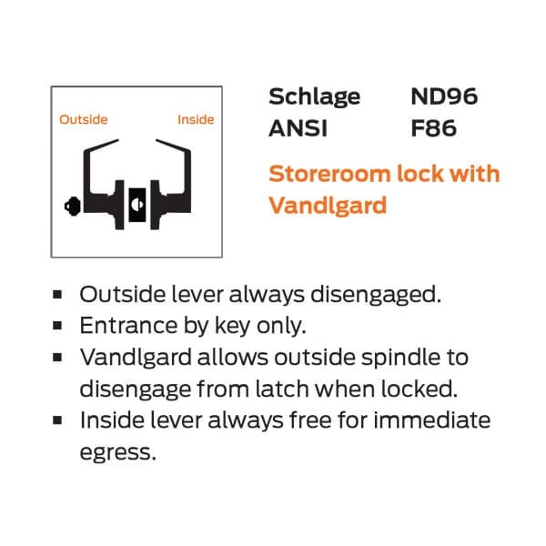ANSI Function F86 - Outside lever always disengaged. - Entrance by key only. - Vandlgard allows outside spindle to disengage from latch when locked. - Inside lever always free for immediate egress.