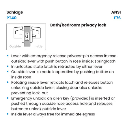 ANSI Function F76 – Lever with emergency release privacy-pin access in rose outside; lever with push button in rose inside; springlatch • In unlocked state latch is retracted by either lever • Outside lever is made inoperative by pushing button on inside rose • Rotating inside lever retracts latch and releases button unlocking outside lever; closing door also unlocks preventing lock-out • Emergency unlock: an allen key (provided) is inserted or pushed through outside rose access hole and releases button to unlock outside lever • Inside lever always free for immediate egress