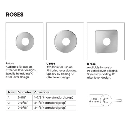 - Door Prep: C and D large roses fit 2-1/8" (54 mm) bore and ANSI/SDI A250.14 door prep. A small rose fits 1-7/8" (48") cross bore prep