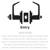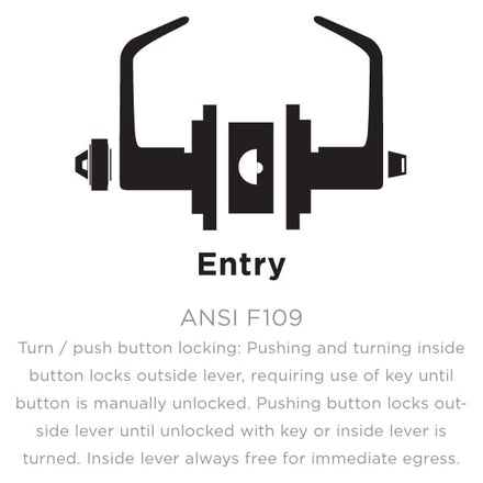 Entry Function, ANSI F109 - Turn / push button locking: Pushing and turning inside button locks outside lever, requiring use of key until button is manually unlocked. Pushing button locks outside lever until unlocked with key or inside lever is turned. Inside lever always free for immediate egress.