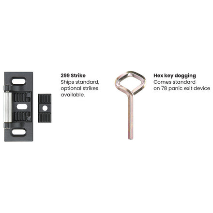 78 Rim exit devices for all types of single and double doors with mullion, UL listed for panic exit hardware. Devices are certified to ANSI/BHMA A156.3 2014, Grade 1. Covers stock hollow metal doors with 86 or 161 cutouts on single doors (may cover cutouts on pairs – consult template).