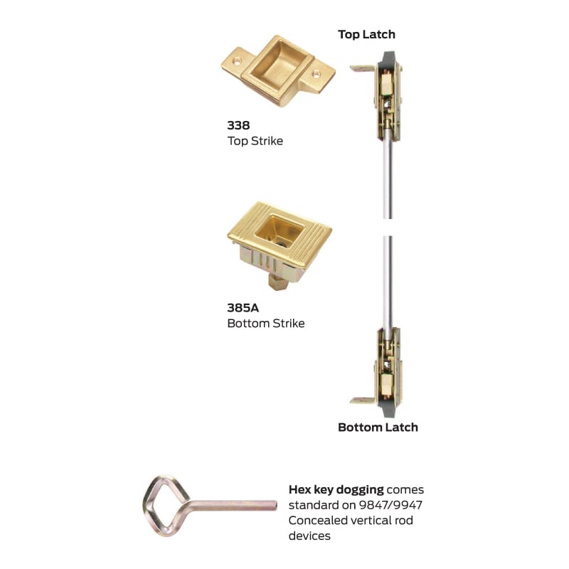 The 99 Series has been certified to the highest industry standards and are used in schools, hospitals, and government buildings. 9947EO-F Concealed vertical rod device for use on single or double metal doors, UL listed fire exit hardware. Devices are ANSI A156.3 – 2014 Grade 1.